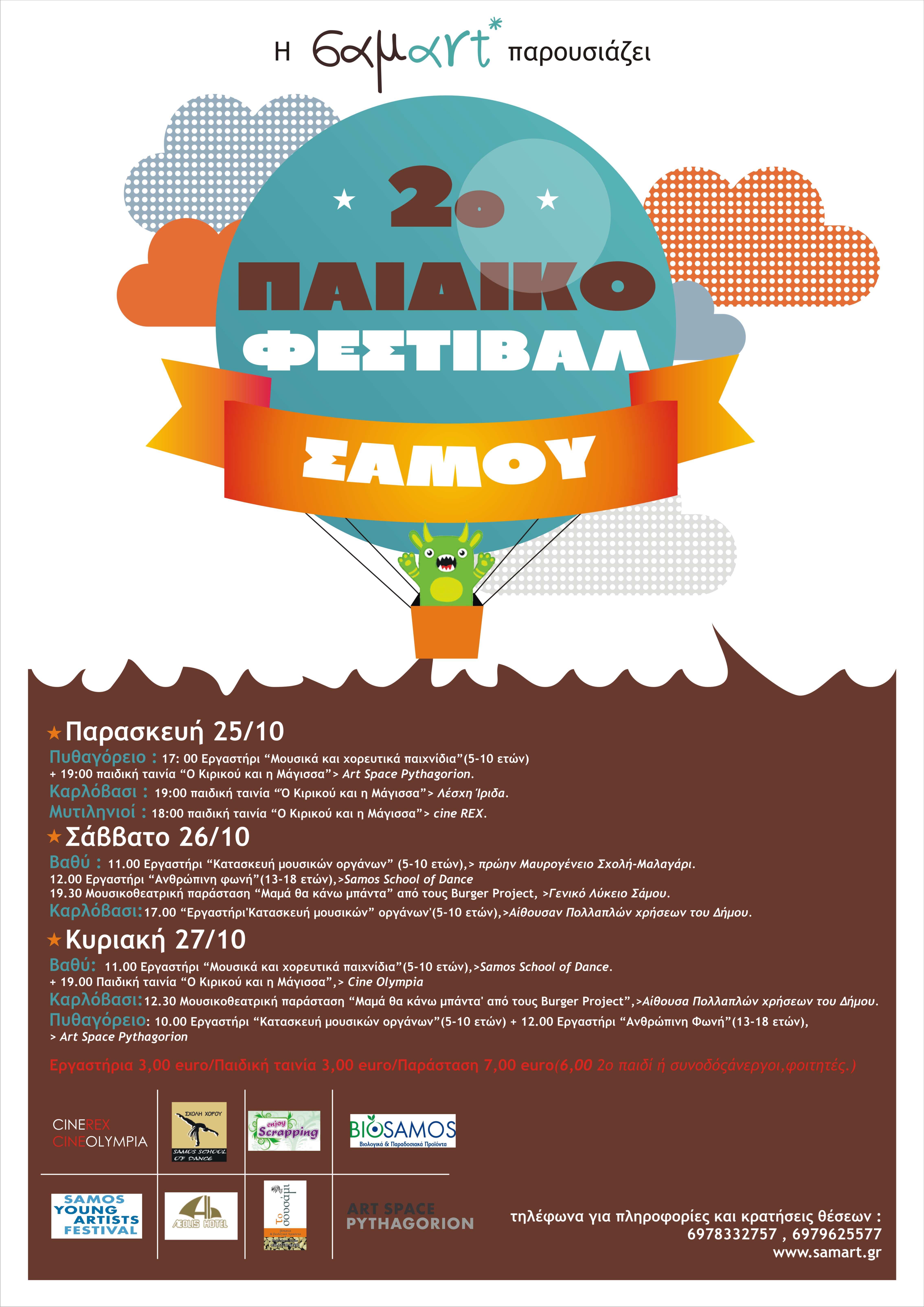 Μετά την περσινή επιτυχία η σαμart διοργανώνει το 2ο Παιδικό Φεστιβάλ Σάμου, στις 25-27 Οκτωβρίου. Ένα τριήμερο εκδηλώσεων για μικρά και μεγάλα παιδιά. Εργαστήρια μουσικής και χορού, προβολή παιδικής ταινίας και μία διαδραστική μουσική παράσταση με πολύ κέφι για παιδιά και γονείς.