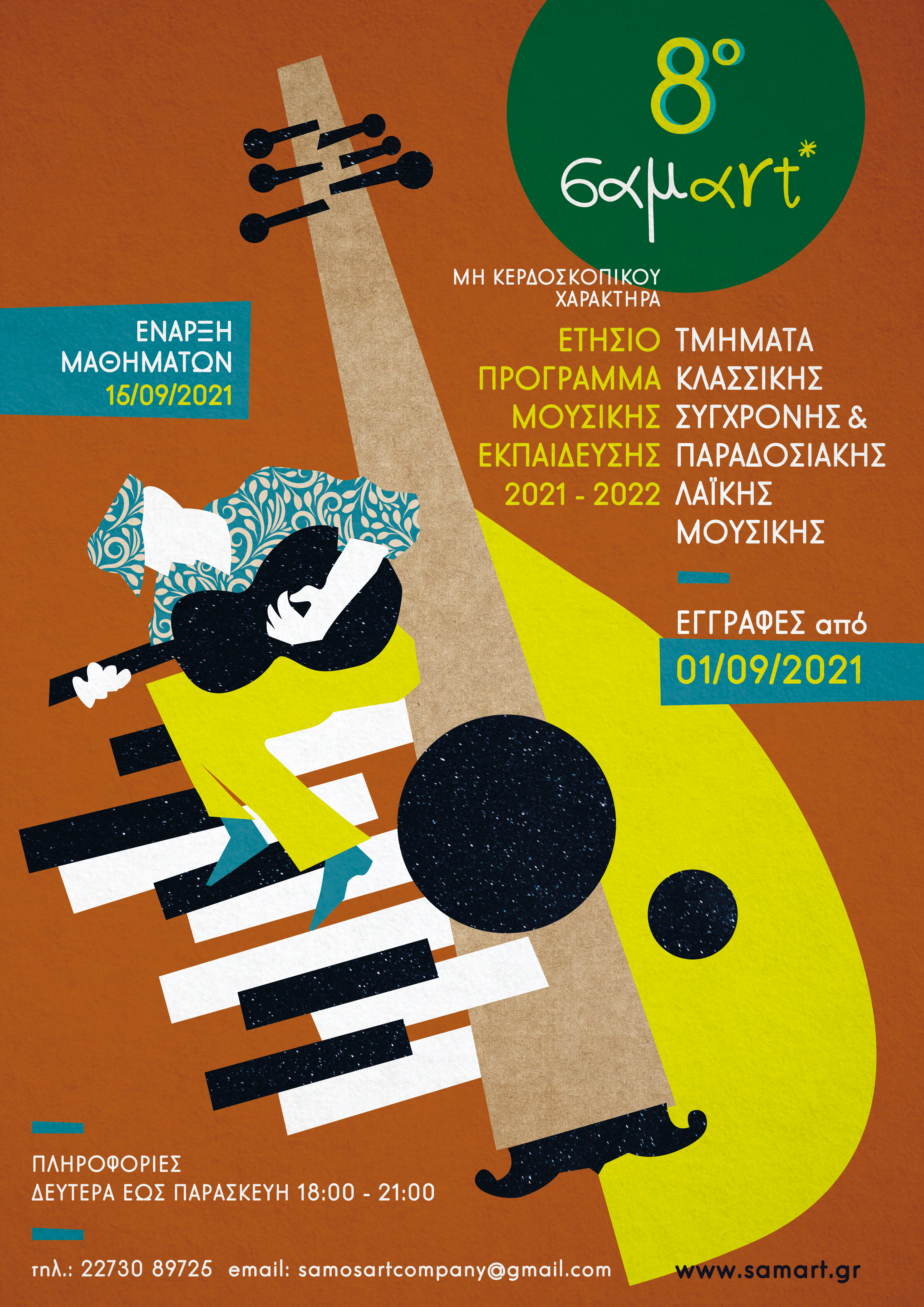 Το Πρόγραμμα Μουσικής Εκπ/σης της “σαμart” διανύει το 7ο έτος συνεχούς λειτουργίας και απευθύνεται σε μικρούς και μεγάλους που ενδιαφέρονται να εκφραστούν μέσω της μουσικής, να μάθουν την τέχνη εκτέλεσης κάποιου μουσικού οργάνου, να συμμετέχουν σε συναυλίες και μουσικά σύνολα και να επικυρώσουν, εφόσον το επιθυμούν, τις σπουδές τους μέσα από τη διαδικασία εξετάσεων σε συνεργασία με το Ωδείο “Ορφείο” Αθηνών. Τα τμήματα που λειτουργούν για την περίοδο 2020-2021 είναι: Κλασικής, Σύγχρονης και Παραδοσιακής & Λαϊκής Μουσικής.