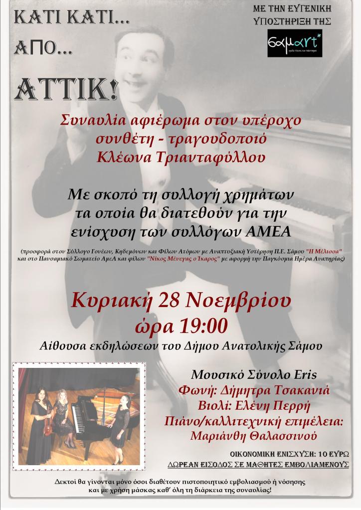 Η ΣΑΜΑΡΤ στηρίζει την πρωτοβουλία τριών καθηγητριών της για την πραγματοποίηση συναυλίας όπου όλα τα έσοδα της θα διατεθούν προς ενίσχυση 2 συλλόγων του νησιού (το σωματείο ΑμεΑ “Νίκος Μένεγας  ο Ίκαρος” και το σύλλογο “Μέλισσα“) με αφορμή την παγκόσμια ημέρα αναπηρίας. Θα ακουστούν έργα του Κλέωνος Τριανταφύλλου, γνωστού ως Αττίκ. Ερμηνεύουν η σοπράνο Δήμητρα Τσακανιά, η Ελένη Περρή (βιολί) και η Μαριάνθη Θαλασσινού (πιάνο). Το σύνολο θα παρουσιάσει ένα πρόγραμμα απαιτητικό με σκοπό τη γνωριμία του κοινού με έναν ιδιαίτερα αξιόλογο μουσικό και τραγουδοποιό της παλιάς Αθήνας.