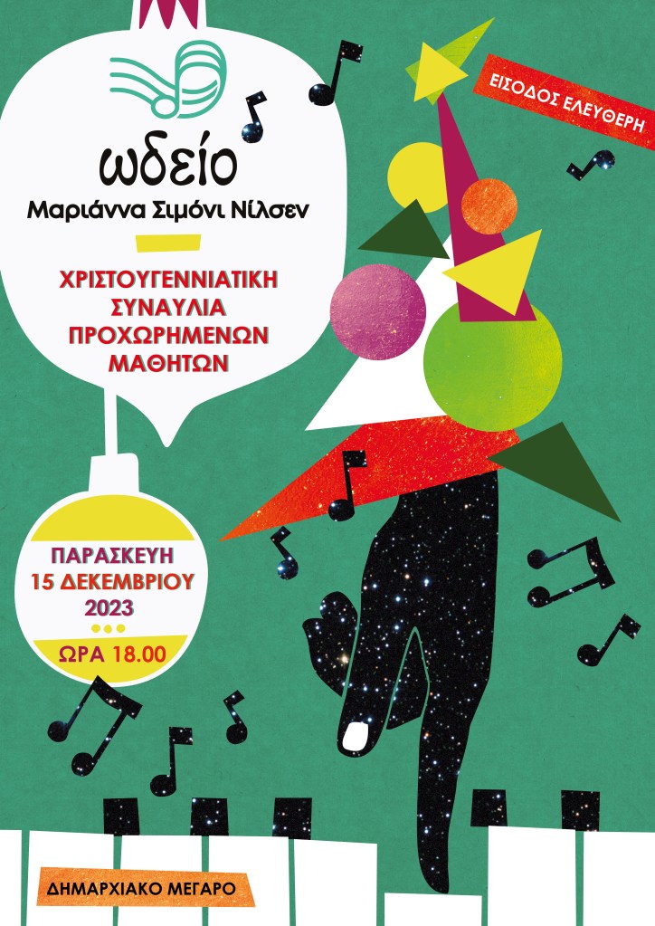 Την Παρασκευή 15 Δεκεμβρίου 2023 στις 18.00 στην αίθουσα του δημαρχειακού Μεγάρου Ανατολικής Σάμου θα πραγματοποιηθεί η Χριστούγεννιάτικη συναυλία του νεοϊδρυθέντος ωδείου “Μαριάννα Σιμόνι Νίλσεν”! Συμμετέχουν οι προχωρημένοι σπουδαστές πιάνου, τρομπέτας, κιθάρας και τα τμήματα μουσικής προπαιδείας και προθεωρίας. Είσοδος ελεύθερη