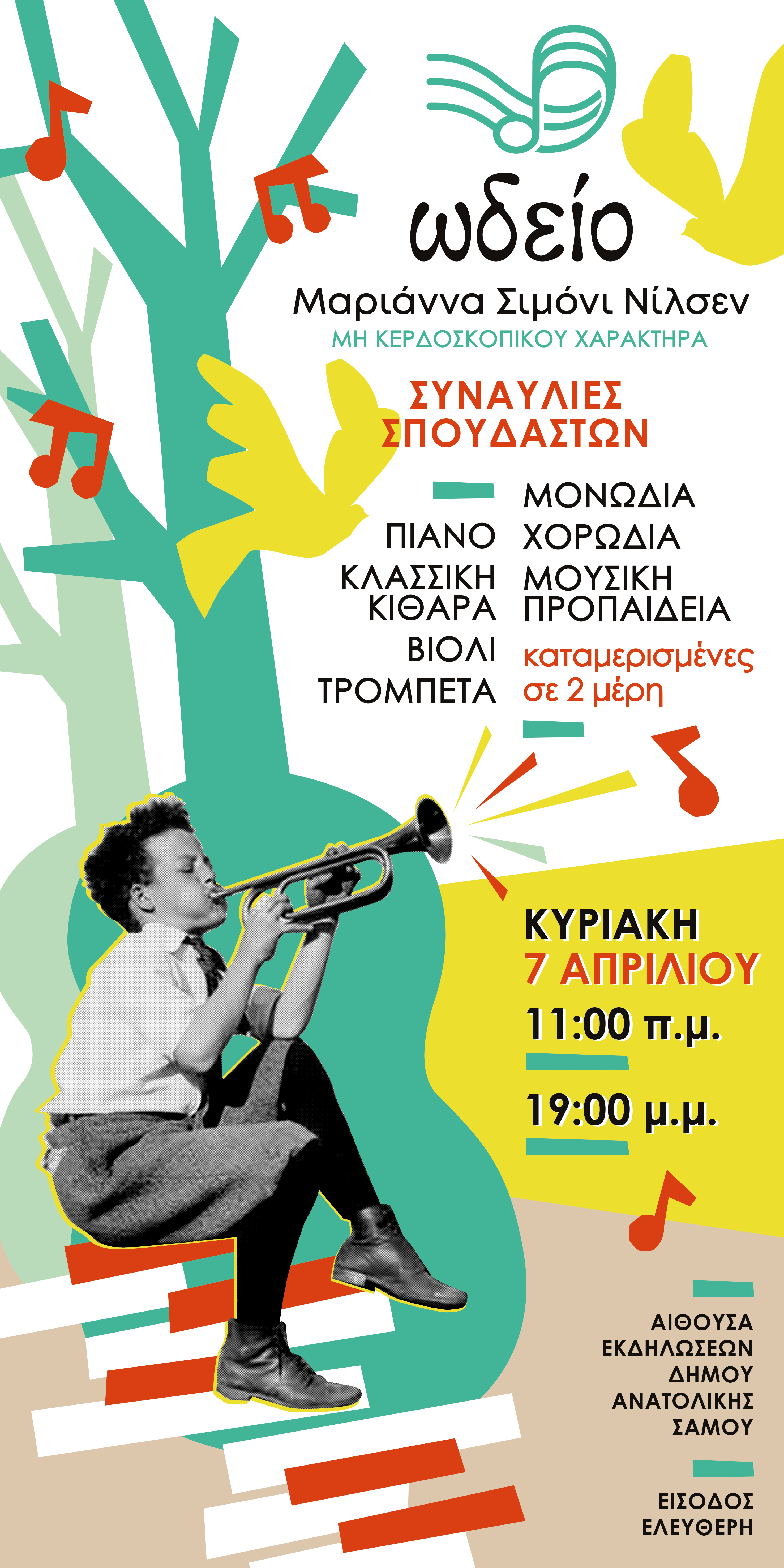 Την Κυριακή 7 Απριλίου 2024, στην αίθουσα του Δήμου Ανατολικής Σάμου, οι σπουδαστές του Ωδείου “Μαριάννα Σιμόνι Νίλσεν” όλων των τάξεων θα παρουσιάσουν ένα πλούσιο μουσικό πρόγραμμα. Λόγω της αυξημένης συμμετοχής, θα πραγματοποιηθει σε δύο μέρη: πρωί και απόγευμα.