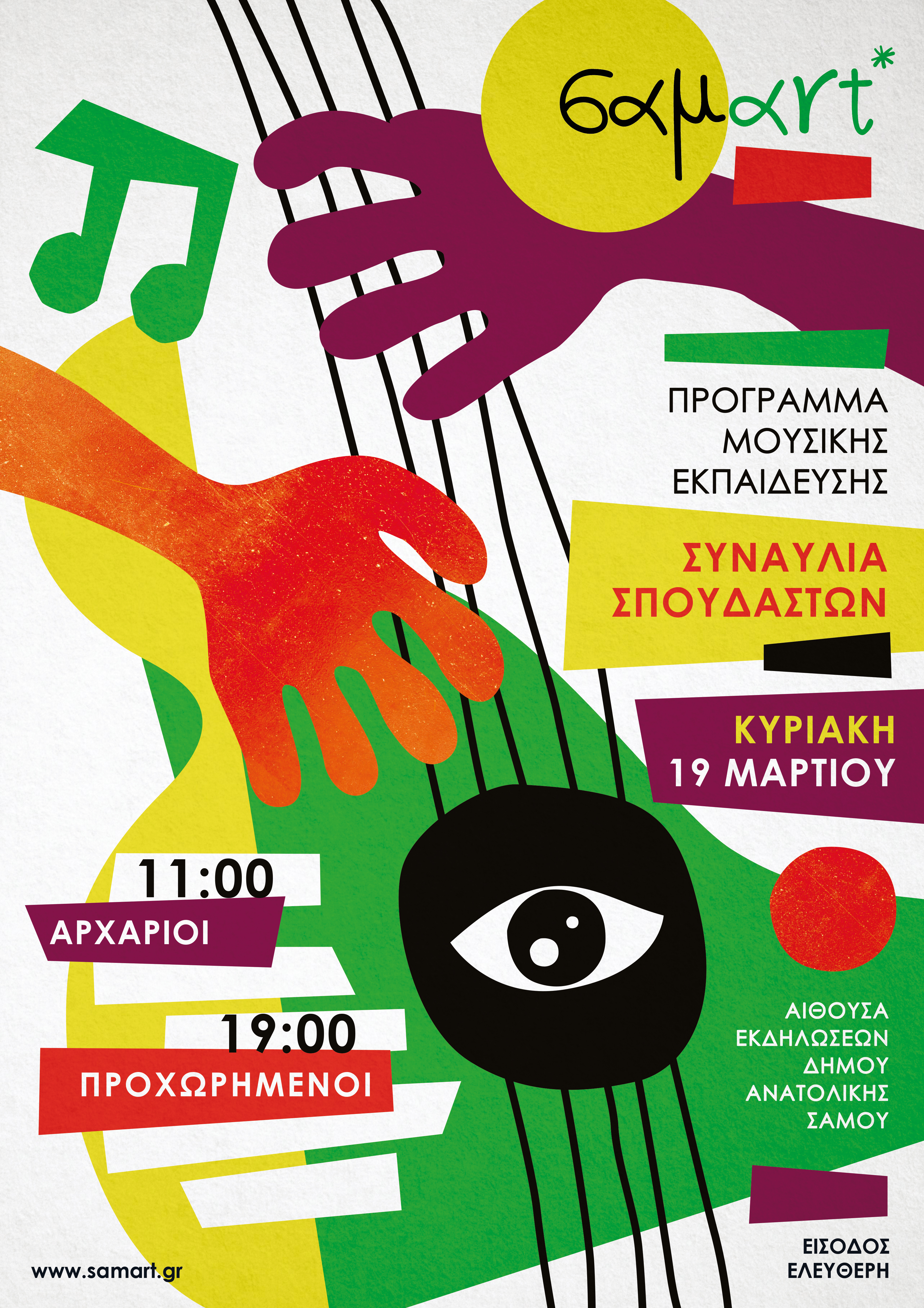 Το Πρόγραμμα Μουσικής Εκπ/σης της “σαμart” έφτασε αισίως στο 10ο έτος συνεχούς λειτουργίας του και εξακολουθεί να καλλιεργεί μουσικά μικρούς και μεγάλους που ενδιαφέρονται να εκφραστούν μέσω της μουσικής, να μάθουν την τέχνη εκτέλεσης κάποιου μουσικού οργάνου από εμπειρους επαγγελματίες μουσικούς, να συμμετέχουν σε συναυλίες και μουσικά σύνολα και να επικυρώσουν, εφόσον το επιθυμούν, τις σπουδές τους μέσα από τη διαδικασία εξετάσεων.