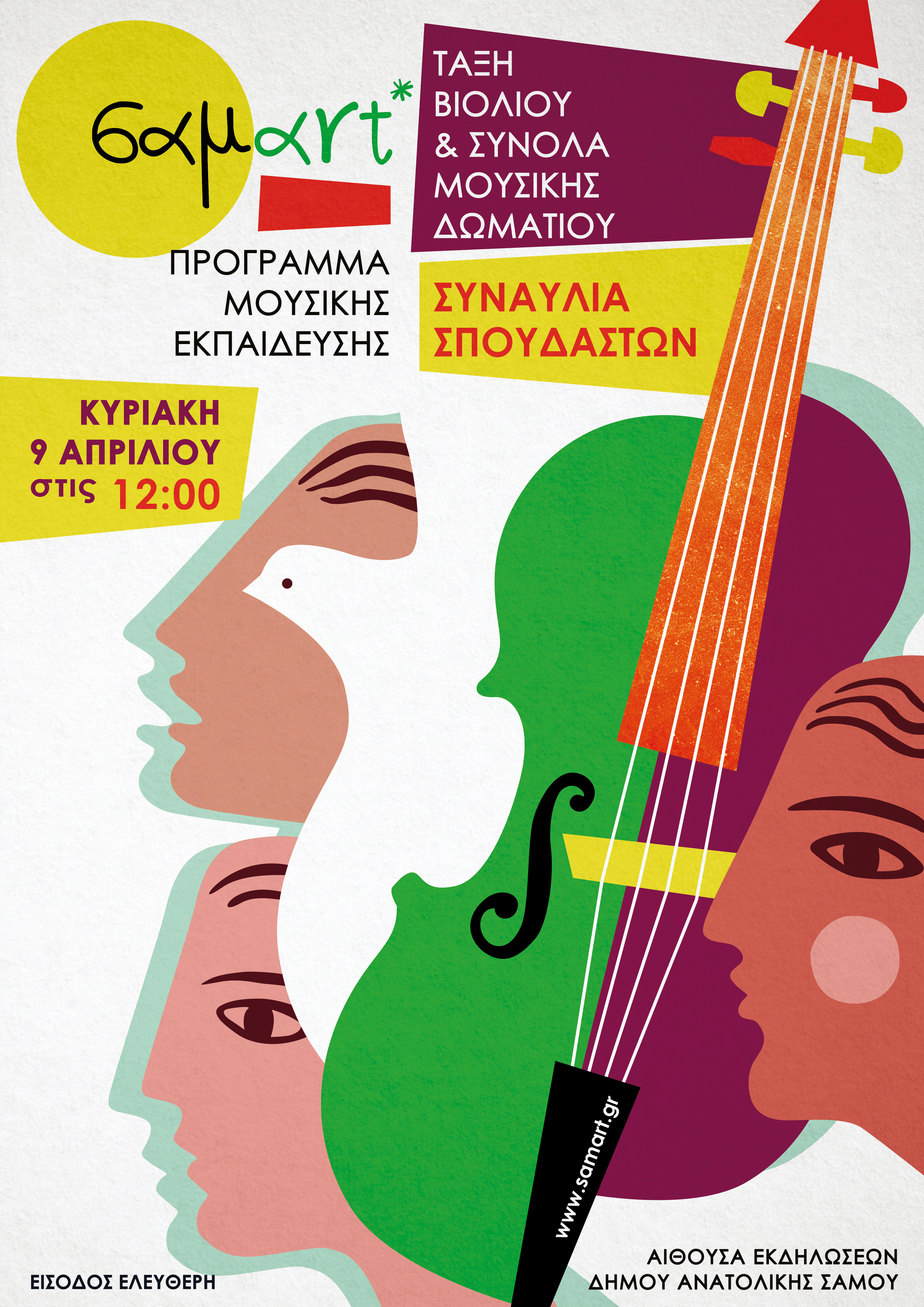 Το Πρόγραμμα Μουσικής Εκπ/σης της ΣΑΜΑΡΤ ολοκληρώνει τις εαρινές συναυλίες των σπουδαστών του με μια εκδήλωση αφιερωμένη στο “βασιλιά των οργάνων”, το βιολί! Συμμετέχουν οι προχωρημένοι σπουδαστές των τάξεων βιολιού και οι καθηγητές τους, οι οποίοι θα ερμηνεύσουν κλασικά και κινηματογραφικά έργα σε ντουέτα και σύνολα μουσικής δωματίου. Το πρόγραμμα εμπλουτίζουν μαθητες της τάξεις του πιάνου. Η συναυλία θα πραγματοποιηθεί την Κυριακή των Βαϊων 9 Απριλίου 2023 στις 12.00 το μεσημέρι στην αίθουσα εκδηλώσεων του Δήμου Ανατολικής Σάμου. Είσοδος ελεύθερη