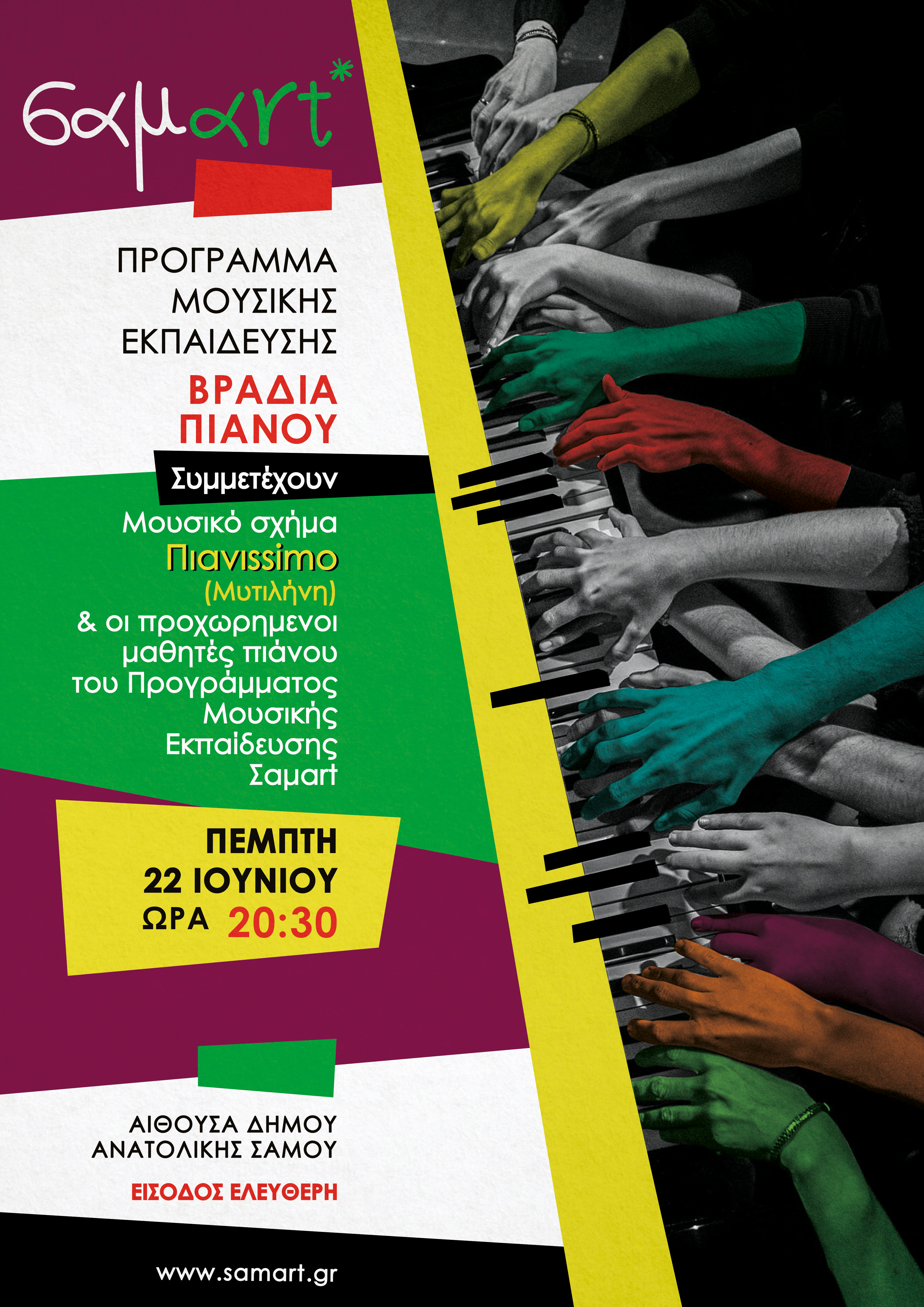 To Πρόγραμμα Μουσικής Εκπ/σης της ΣΑΜΑΡΤ διοργανώνει μια βραδιά πιάνου με το μουσικό σχήμα Πιανissimo. Πρόκειται για μία μουσική ομάδα από τη Μυτιλήνη, ιδιαιτέρως αγαπητή στον τόπο της. Αποτελείται από πέντε μαθητές πιάνου υψηλού επιπέδου και δύο καθηγήτριες-σολίστ, την Νίκη Κεραμέκη και την Ντίνα Τσαλίκη. Η ομάδα άρχισε να εδραιώνεται μετά τη δύσκολη περίοδο του κορονοϊού. Λόγω της έντονης ανάγκης για επικοινωνία και συναισθηματική έκφραση οι Πιανissimo μετέτρεψαν τη μοναχική διαδικασία της μελέτης και της εκτέλεσης σε συλλογική εμπειρία και έρχονται στη Σάμο να τη μοιραστούν με το κοινό της.